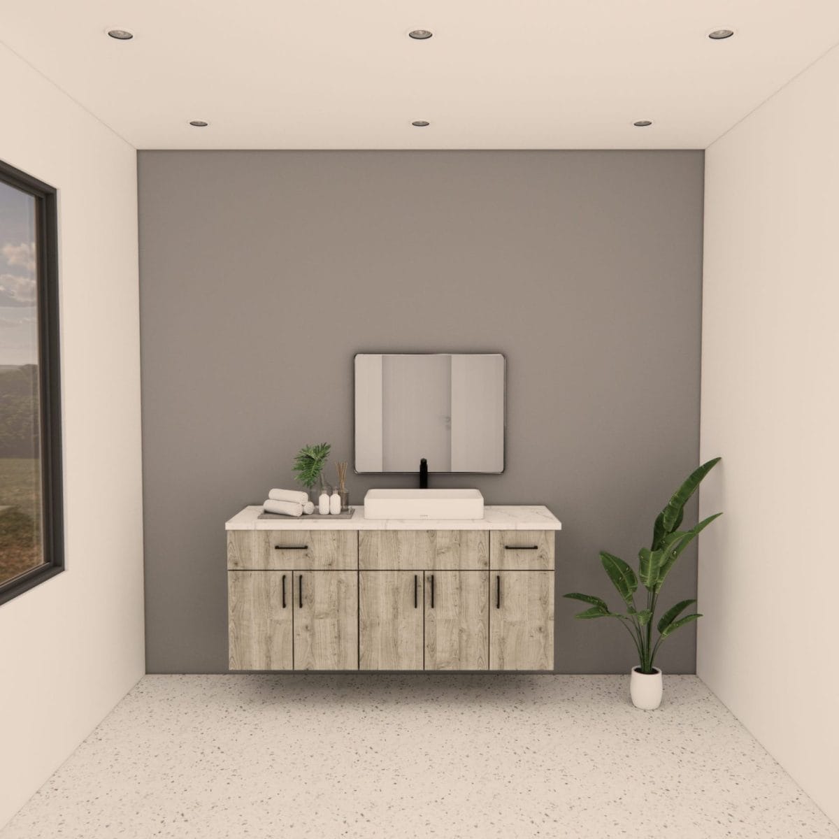 Cette vanité suspendue en mélamine couleur K30 à 1 portes (1P) et 1 tiroir (1T) est disponible en plusieurs largeurs
