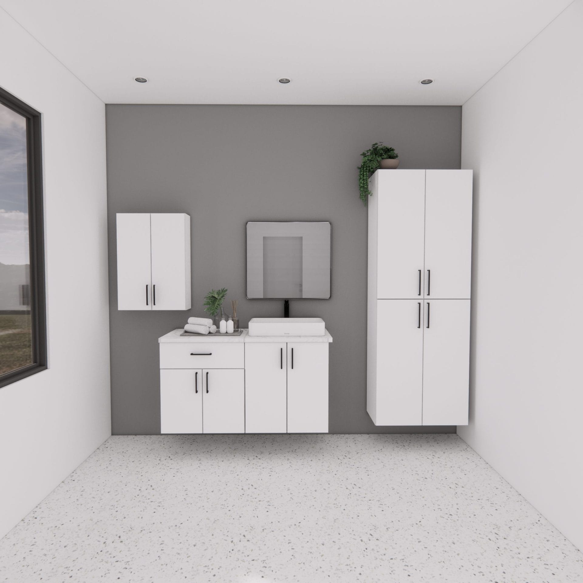 Cette vanité en mélamine blanc à 2 portes (2P) et 1 tiroir (1T) est disponible en plusieurs largeurs